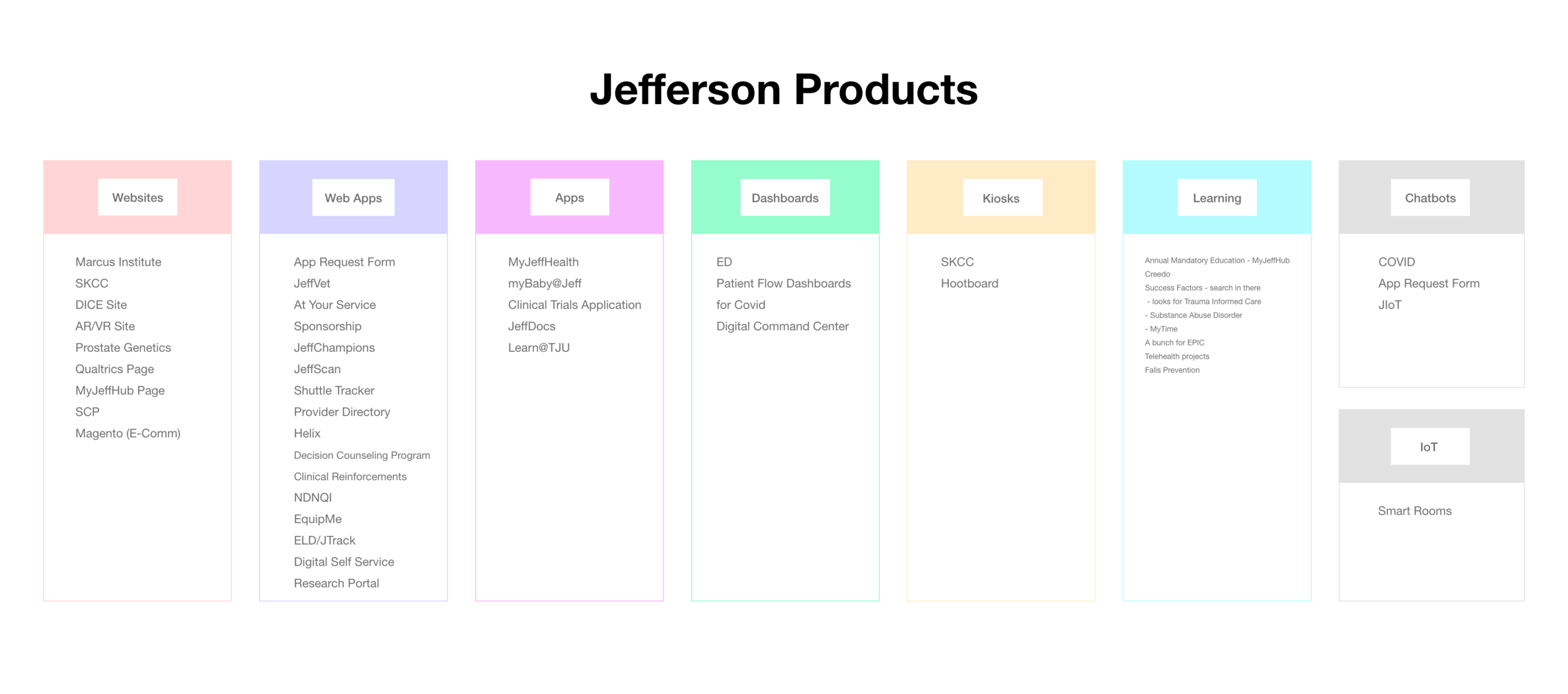 Above is a breakdown of all of the projects my internal department has created and or maintains. There is a large variety between products and these are only half of all Jefferson products out there. There is also a large variety of development platforms, languages, and frameworks used to build them, so it was important to learn any and all design restrictions for each.